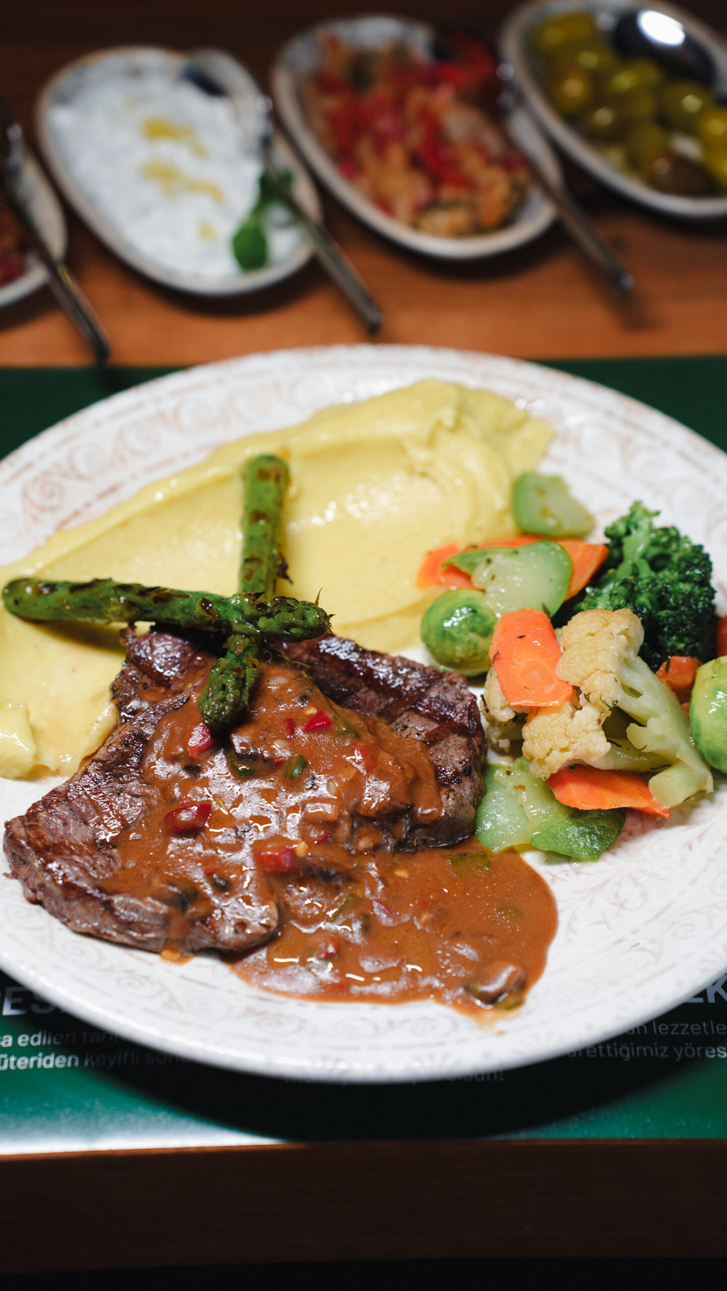 Özenle dinlendirilmiş, içi lokum gibi yumuşacık Takoz Bonfile; yüksek ateşte mühürlenerek lezzet hapsedildi. Altında ipeksi dokusuyla tereyağlı Taze Patates Püresi, yanında taze Kuşkonmaz ve mevsimin en zengin sebzeleriyle servis ediliyor. Tabağın yıldızı ise, gizli reçetesiyle hazırlanan, damaklarda iz bırakan yoğun ve aromatik Şampiyon Sos.