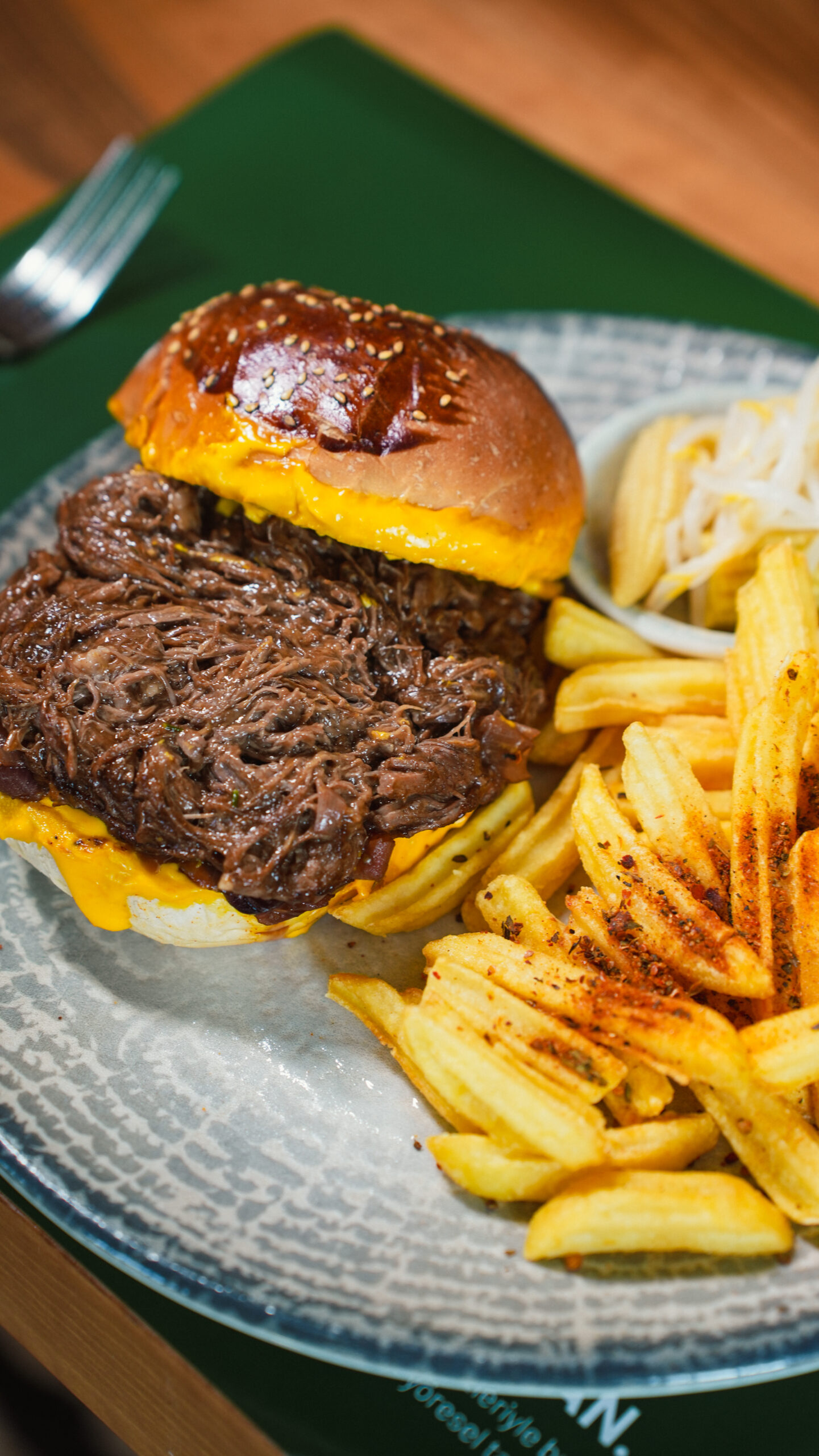 12 saat ağır ateşte pişmiş, lif lif ayrılan lokum gibi dana tiftik eti; üzerine ağır ağır karamelize edilmiş tatlı soğanlar, erimiş yoğun cheddar peyniri ve tütsülenmiş barbekü sosun enfes uyumu. Her ısırıkta ayrı bir lezzet patlaması.